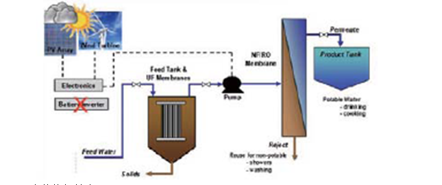 太陽能/風(fēng)能驅(qū)動水脫鹽凈化處理系統(tǒng) rosi系統(tǒng)由三個關(guān)鍵部分構(gòu)成:通過太陽能/風(fēng)能驅(qū)動的水泵,高品質(zhì)超濾器,納米過濾器/反滲透膜。