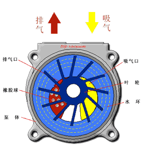 葉輪與泵殼成偏心,泵殼內(nèi)充一定量的水,葉輪旋轉(zhuǎn)使水形成水環(huán)。相鄰葉片(如圖中紅色葉片)旋轉(zhuǎn)時(shí),與水環(huán)形成的空間(氣室)變大即進(jìn)氣,空氣(氣室)逐漸變小,即空氣被壓縮。多組相鄰葉片,即多組往復(fù)壓縮。結(jié)構(gòu)緊湊、工作平衡可靠和流量均勻,所以化工生產(chǎn)中多用來(lái)輸送或抽吸易燃、易爆和有腐蝕性的氣體。水環(huán)式真空泵由于葉輪攪拌液體,損失能量大,故其效率很低。