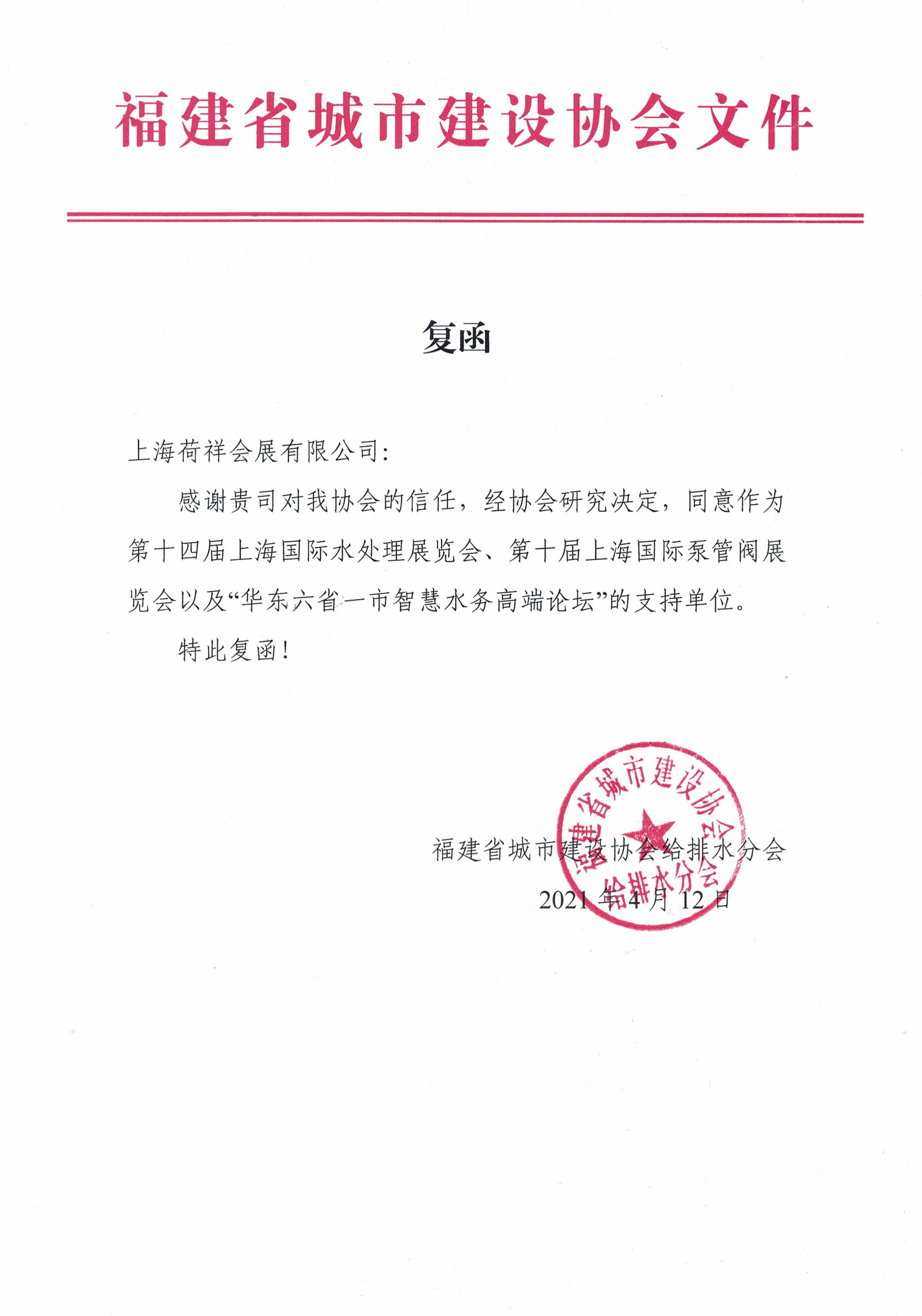 為幫助福建省水務企業進一步開拓市場,促進國內外企業之間的經貿合作與技術交流,福建省城市建設協會給排水分會決定將全力支持 2021 年 6 月 2 日在上海國家會展中心(虹橋)舉辦的2021華東六省一市智慧水務高端論壇,與主辦方上海荷祥會展有限公司攜手為城鎮水務行業搭建一個國際性商貿交流平臺,助力企業更好的抓住行業機遇,積極促進我國城鎮水務行業在"十四五"期間獲得快速發展。