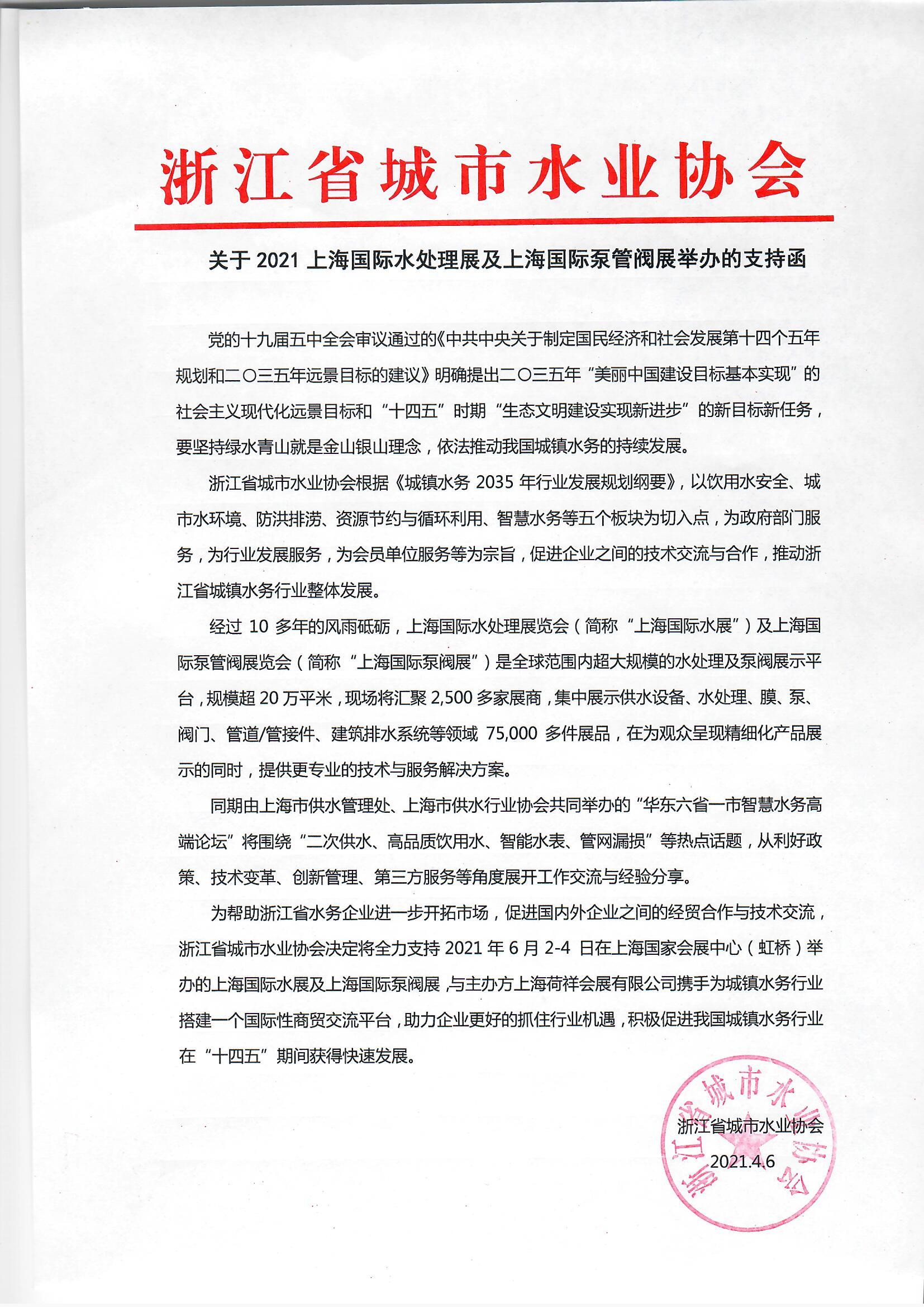 為幫助浙江省水務企業進一步開拓市場,促進國內外企業之間的經貿合作與技術交流,浙江省城市水業協會決定將全力支持 2021 年 6 月 2-4 日在上海國家會展中心(虹橋)舉辦的上海國際水展及上海國際泵閥展,與主辦方上海荷祥會展有限公司攜手為城鎮水務行業搭建一個國際性商貿交流平臺,助力企業更好的抓住行業機遇,積極促進我國城鎮水務行業在"十四五"期間獲得快速發展。