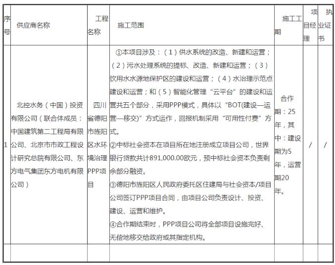 3月11日,四川省德陽市旌陽區(qū)水環(huán)境治理ppp項目采購結(jié)果確認談判公示發(fā)布,中標人為北控水務(wù)(中國)投資有限公司(聯(lián)合體成員:中國建筑第二工程局有限公司、北京市市政工程設(shè)計研究總院有限公司、東方電氣集團東方電機有限公司)聯(lián)合體,中標價為15590.26608萬元。
