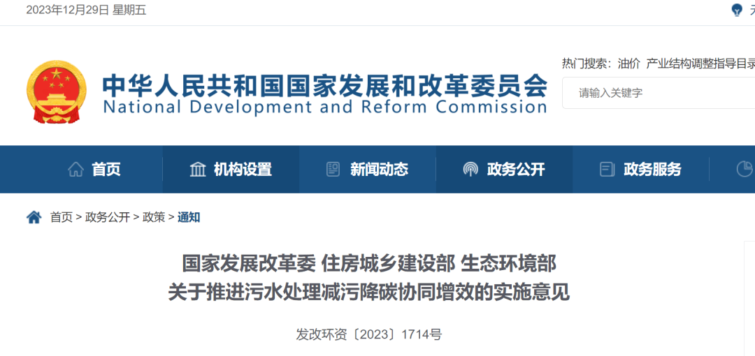 國家發展改革委 住房城鄉建設部 生態環境部關于推進污水處理減污降碳協同增效的實施意見